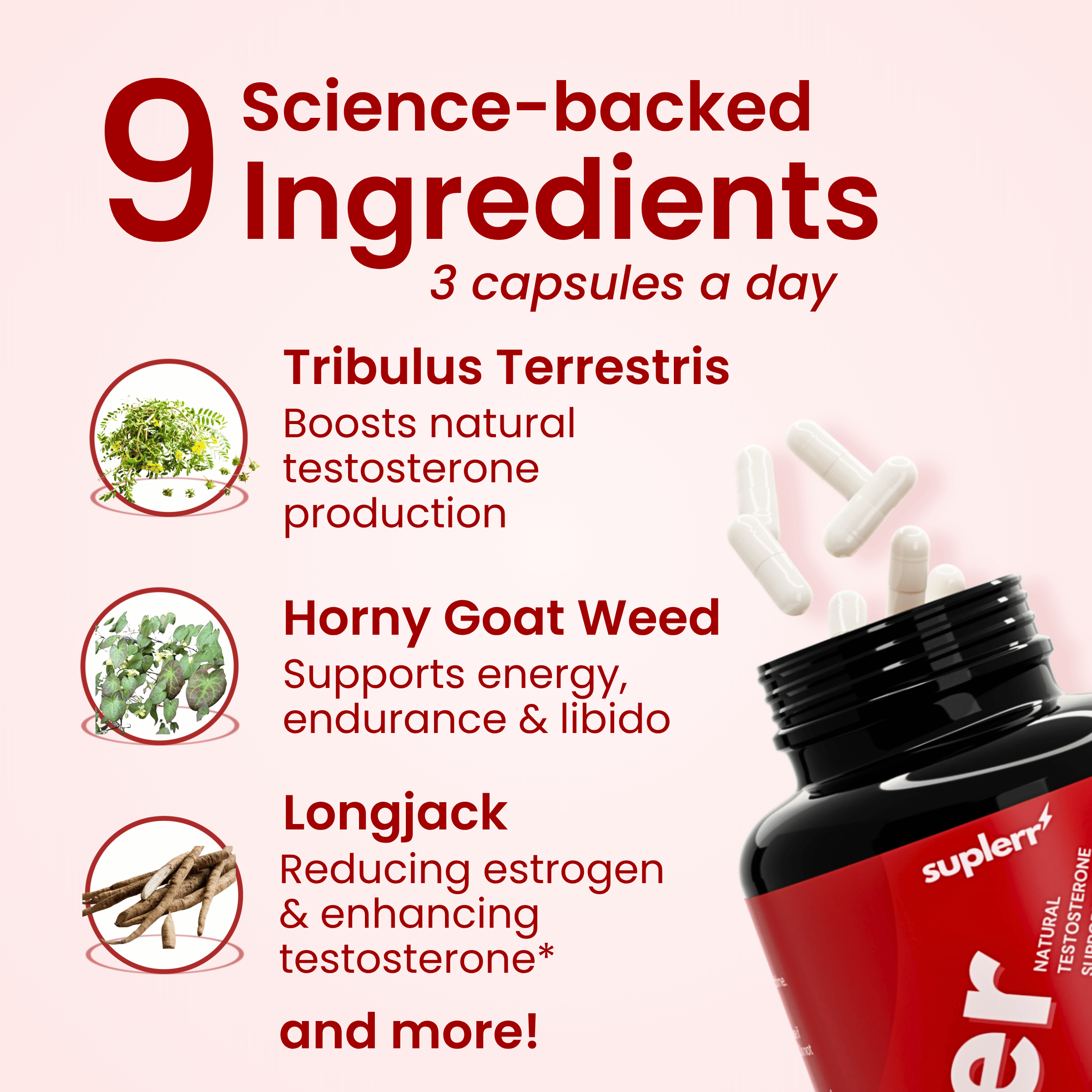 The formula includes Magnesium, Zinc, Tribulus Terrestris, Chrysin, Horny Goat Weed, Longjack, Saw Palmetto Berries, Hawthorn Berries, and Cissus Quadrangularis.