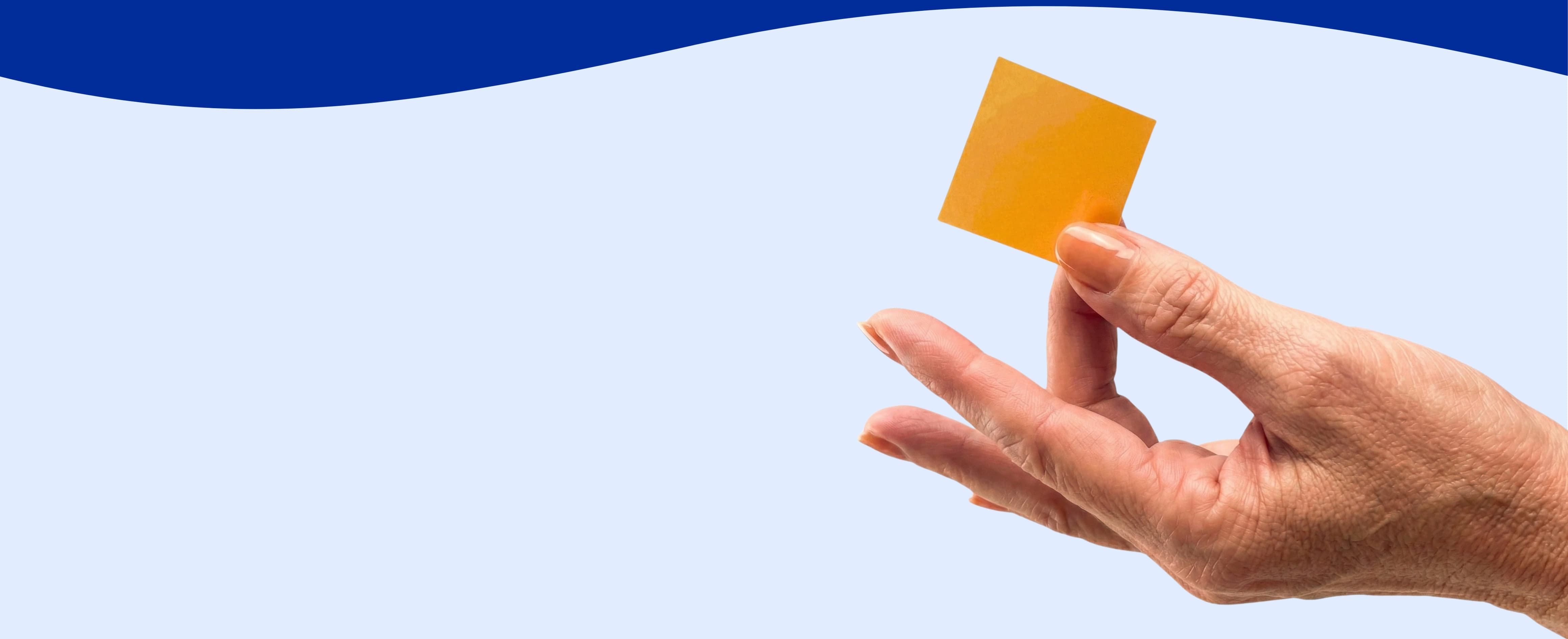 A person's hand holds a small orange square against a light blue background with a dark blue wave.
