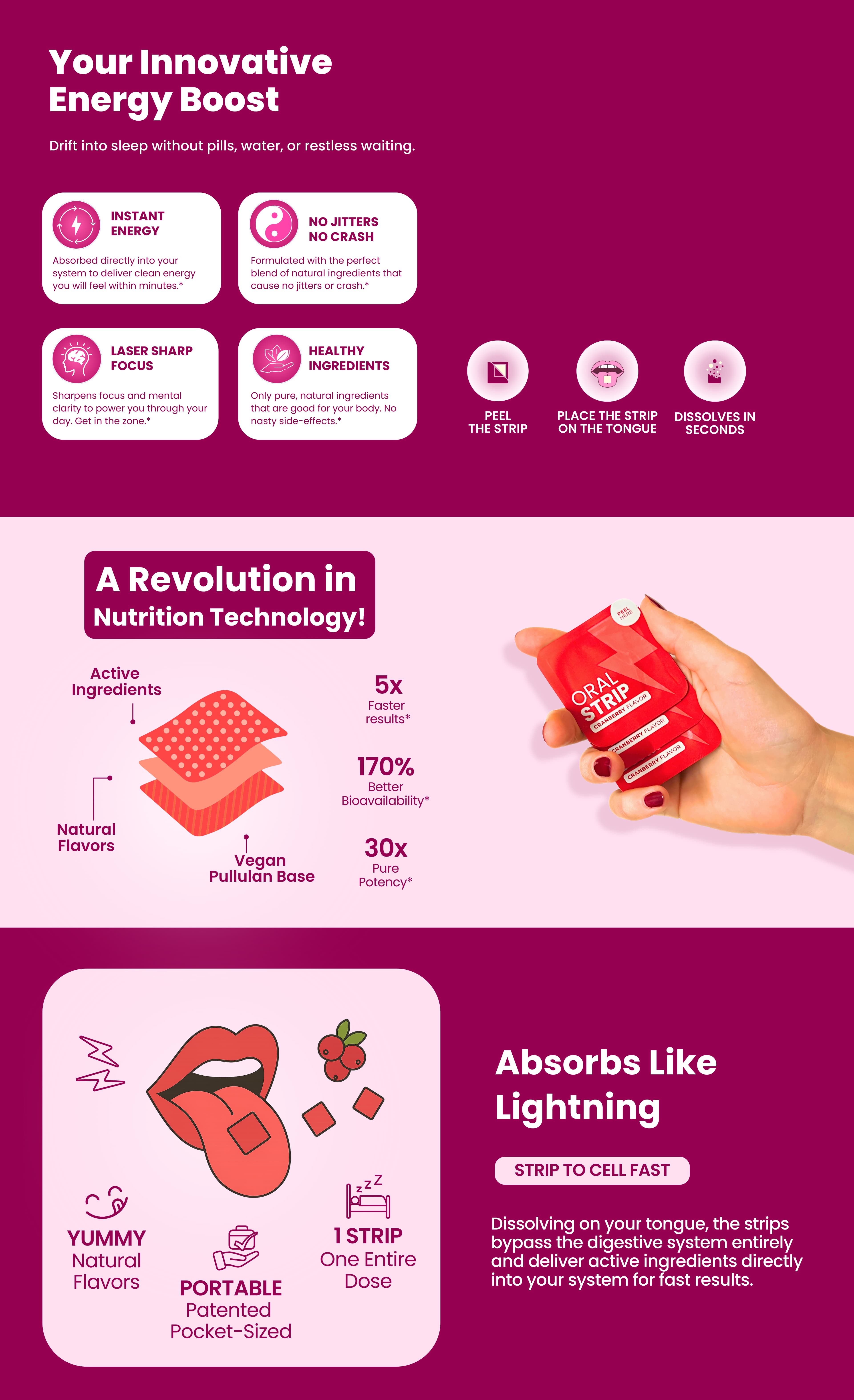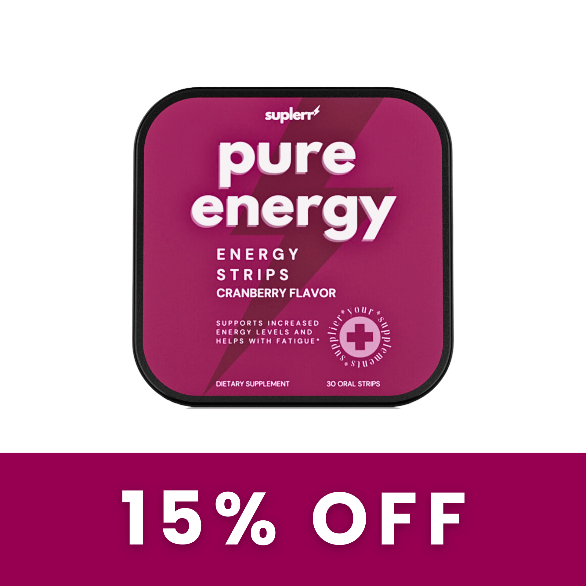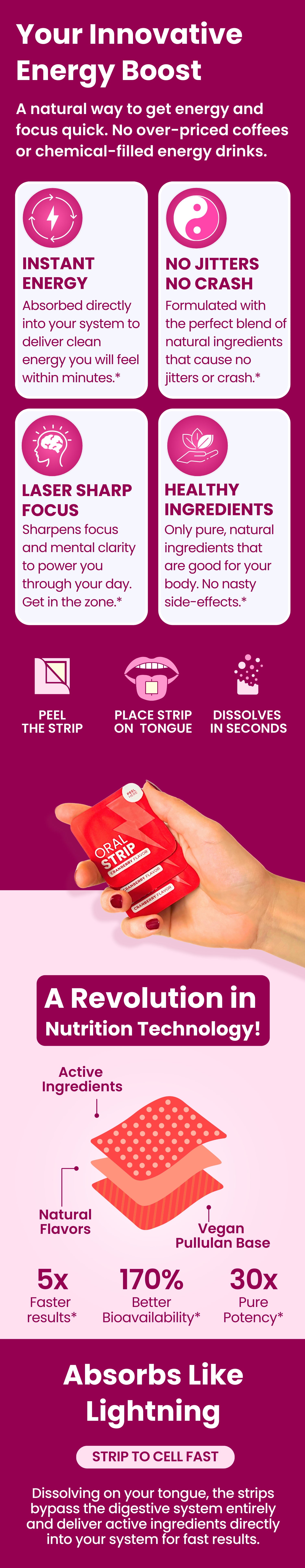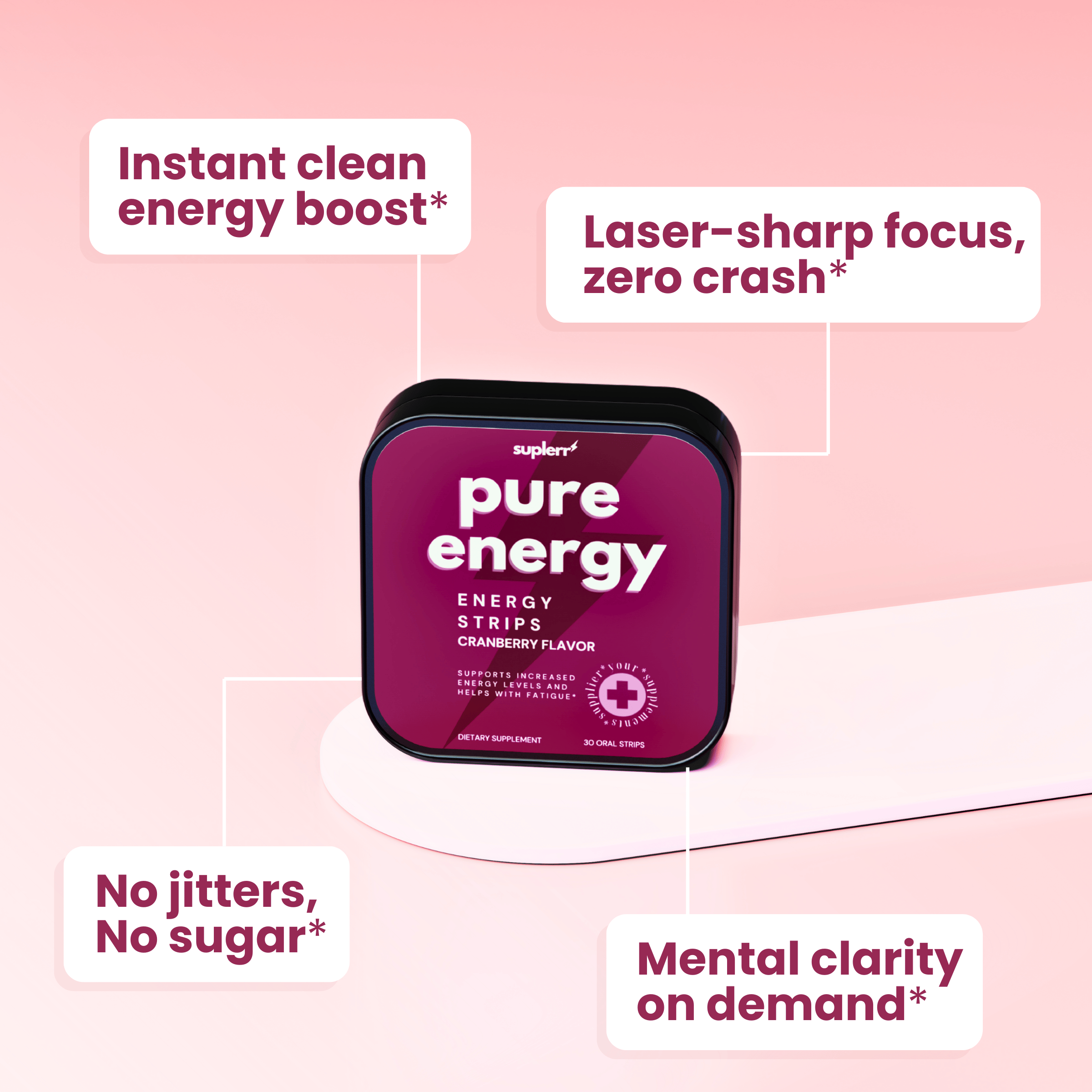 Pure Energy Strips are a convenient, fast-dissolving supplement that provides an instant boost of sustained energy, mental clarity, and focus. These strips are portable, sugar-free, and designed for on-the-go use.*