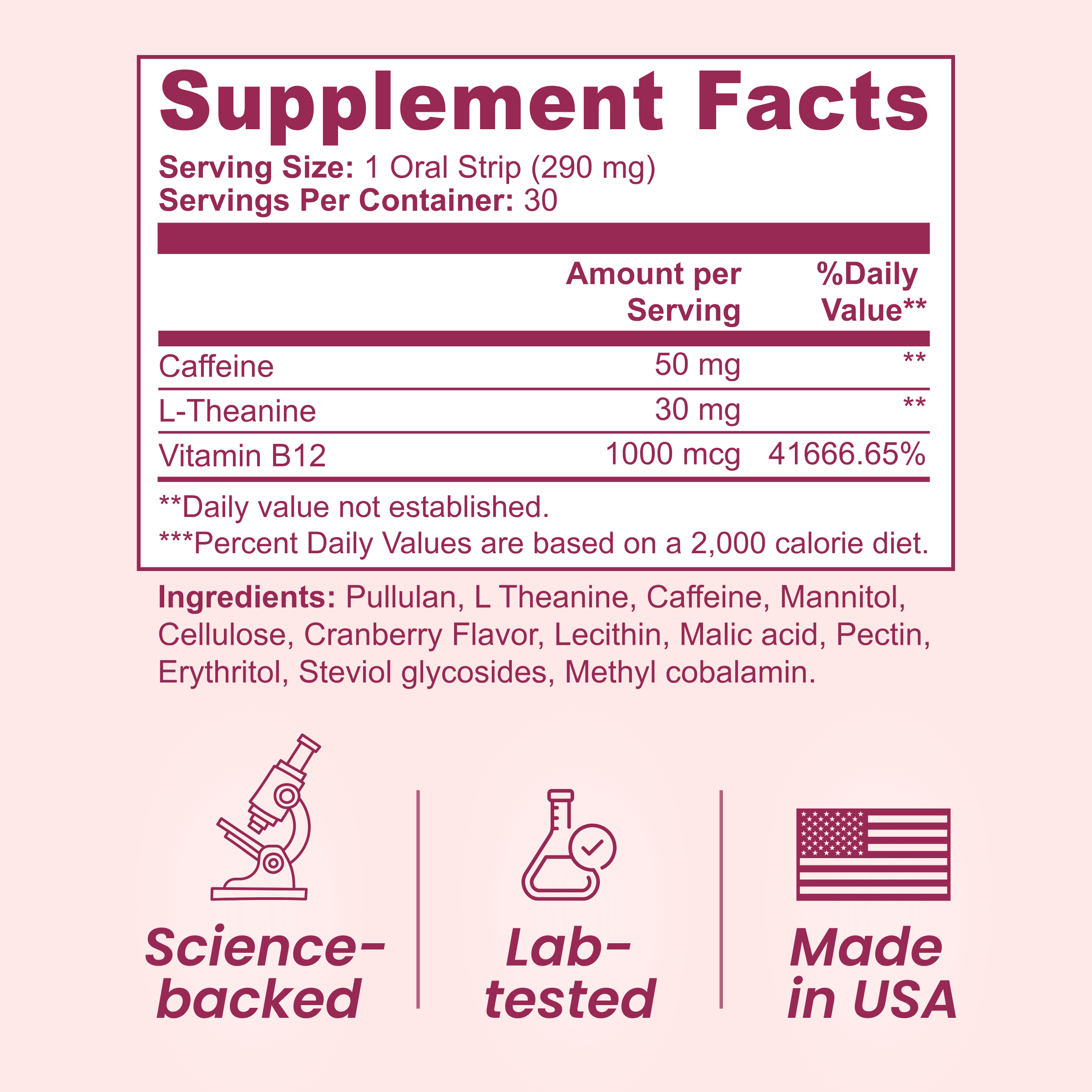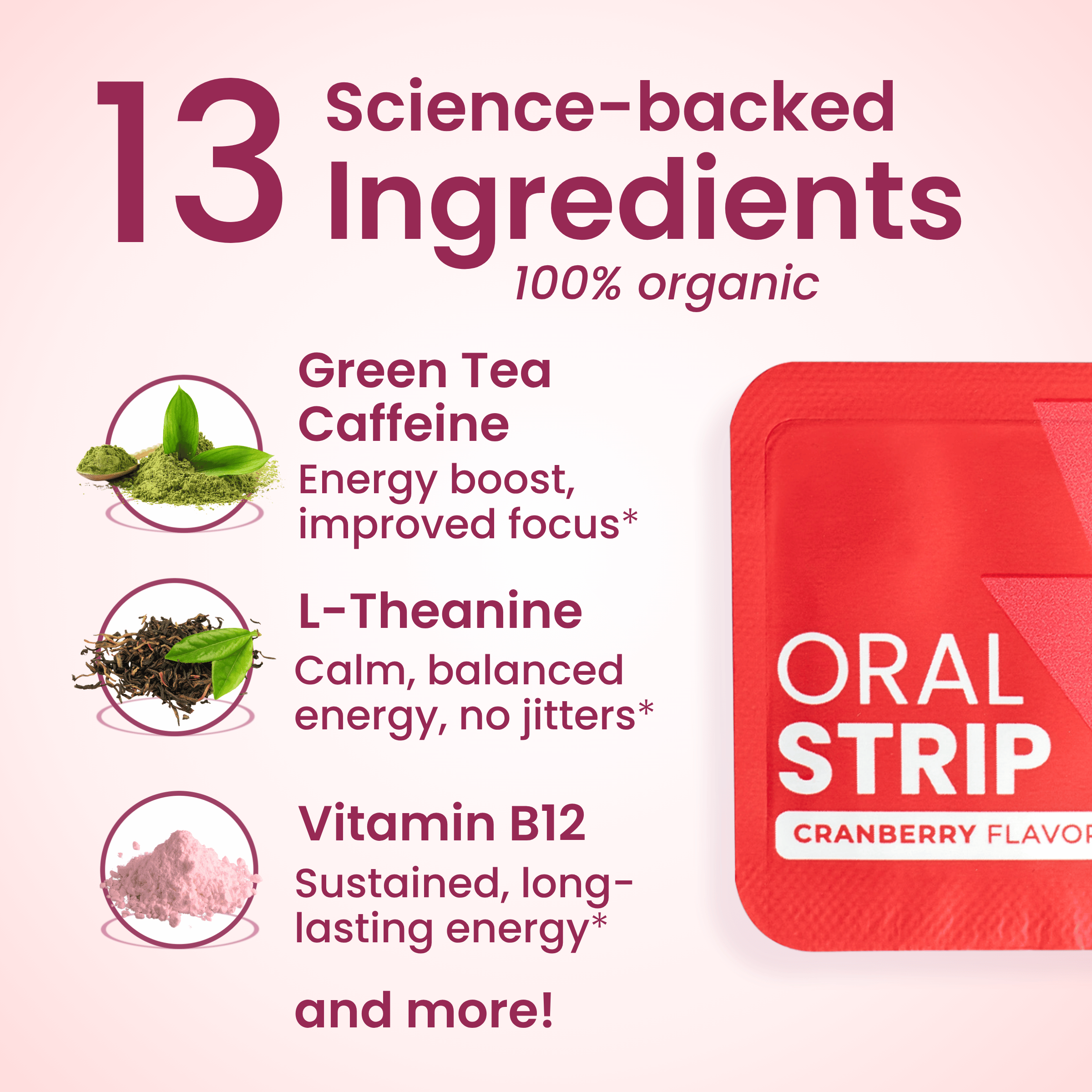 These strips are formulated with Green Tea Caffeine, L-Theanine, Vitamin B12 and other energizing ingredients to quickly enhance alertness, improve cognitive performance, and provide a clean energy boost without jitters or crashes.*